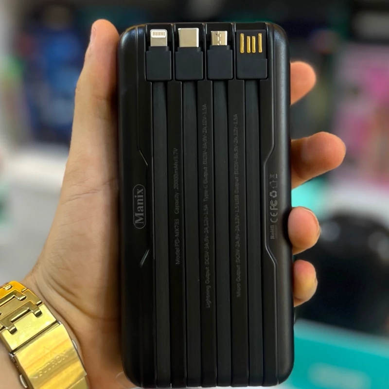 20هزار میلی امپر بهترین در نوع خودش دارای 4 پورت خروجی چهار کابل فست شارژ متصل به دستگاه دارای چراغ دو تکه ای واسه دوران بی برقی